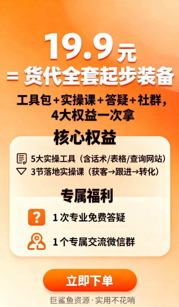 19.9 元是你走进货代高效赚钱的 “敲门砖”,花一顿饭钱,少走 1-2 年弯路,后续还能无缝衔接进阶方案,这笔投入,绝对值!